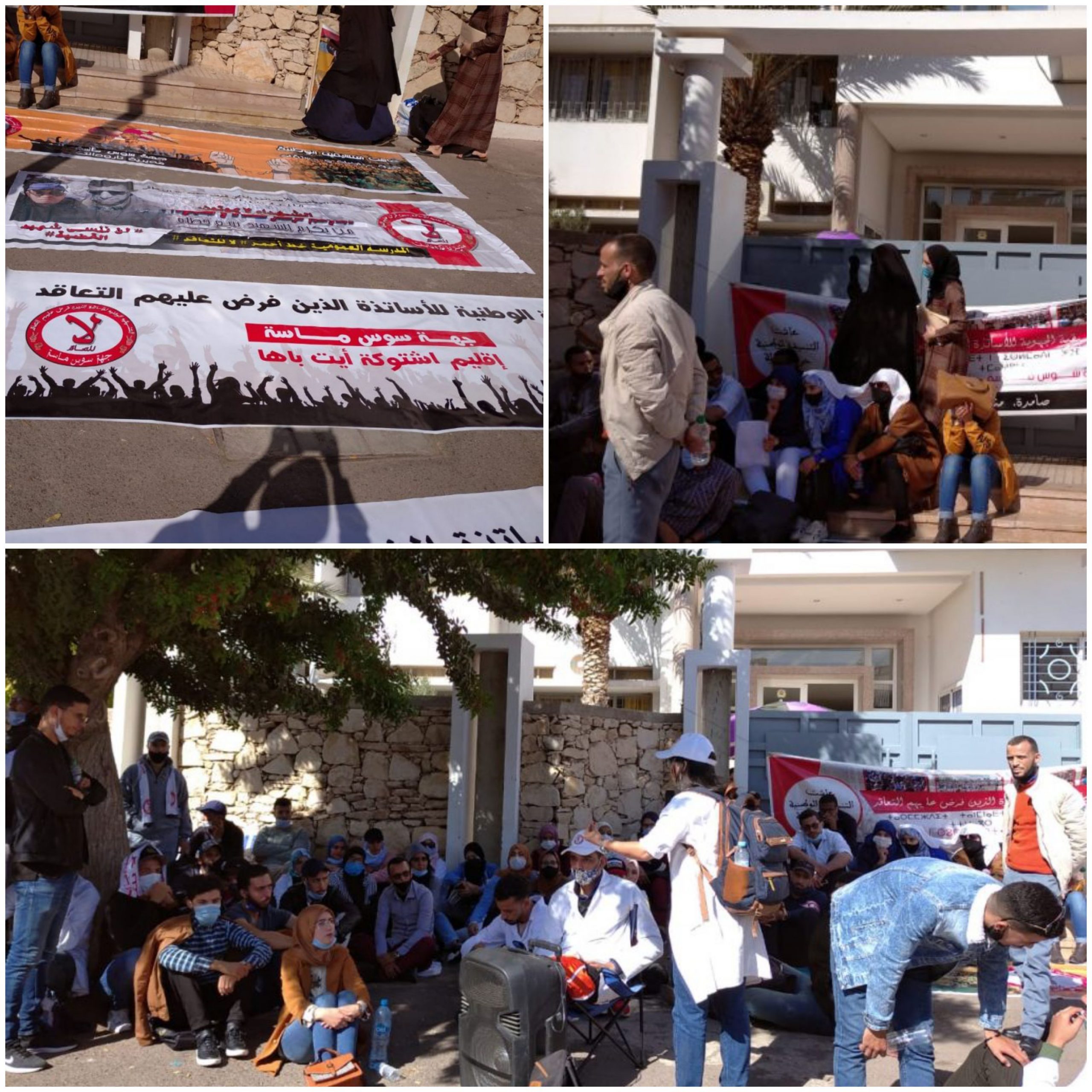 وعلى غرار باقي مدن المملكة، خاض الأساتذة المتعاقدون وقفة احتجاجية باكاديمية التربية والتكوين لجهة سوس ماسة باكادير ، صبيحة اليوم الخميس، رافعين لافتات بشعار ” لا للتعاقد لا لتفكيك المدرسة العمومية، الادماج حق مشروع والنضال هو الخيار”، و “التعاقد جريمة”، وهدد الأساتذة بتمديد الاحتجاجات على مدى شهري نونبر ودجنبر للمطالبة بإسقاط نظام التوظيف بالتعاقد.