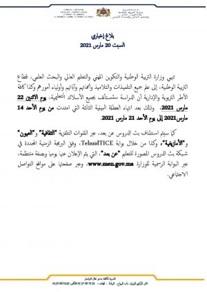 وأضاف بلاغ ذاته ان بعد انتهاء العطلة البينية الثالثة التي امتدت من يوم الأحد 14 مارس 2021 إلى يوم الأحد 21 مارس 2021″.