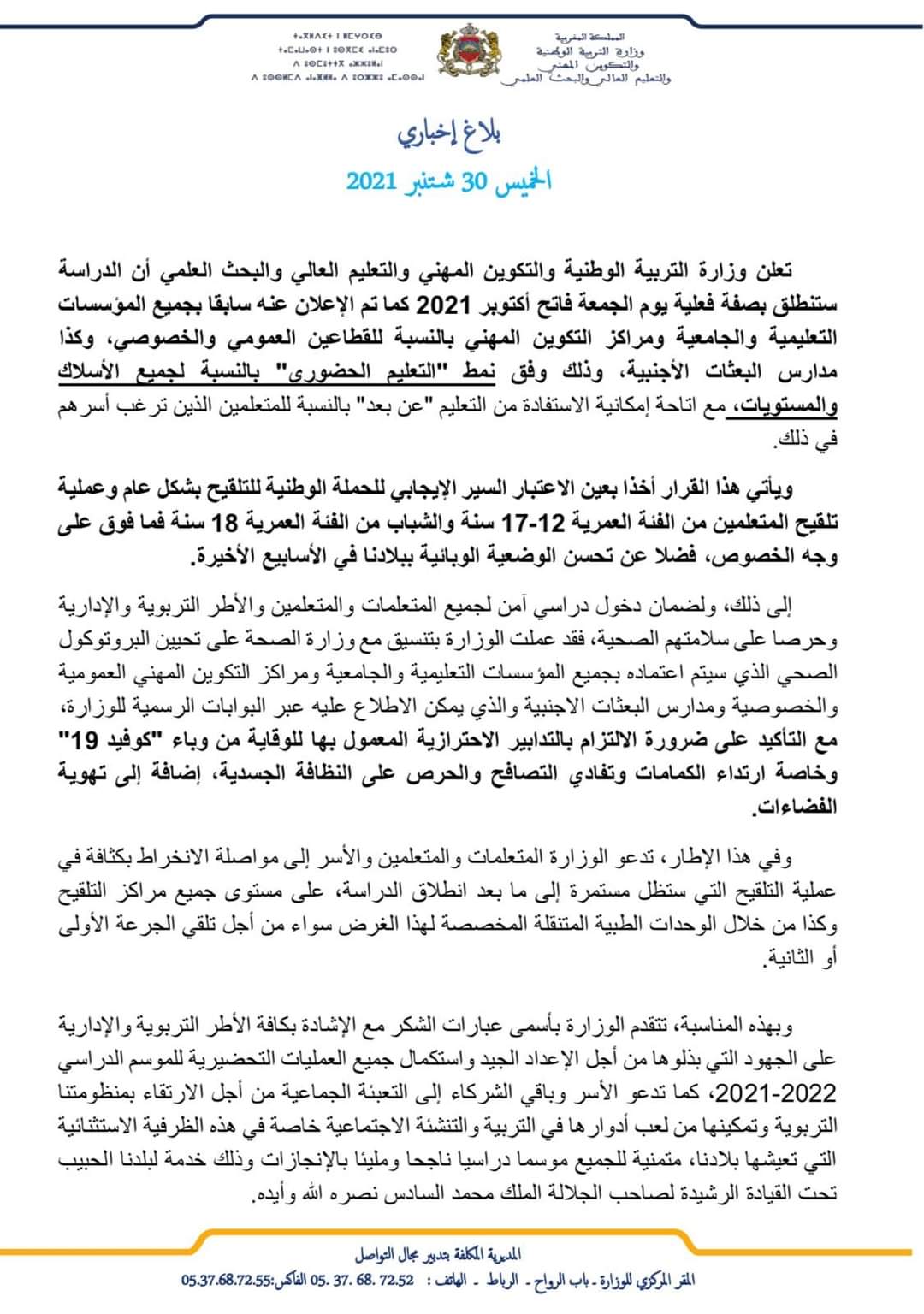 التعليم : غدا الجمعة انطلاق الدراسة بجميع الأسلاك حضوريا وعن بعد