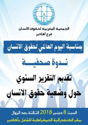 بمناسبة اليوم العالمي لحقوق الانسان تنظم الجمعية المغربية لحقوق الانسان فرع اكادير ندوة صحفية لتقديم التقرير السنوي عن وضعية حقوق الانسان وذلك يوم السبت 8 دجنبر 2018 على الساعة الثالثة بعد الزوال بمقر الكنفدرالية الديمقراطية للشغل باكادير.