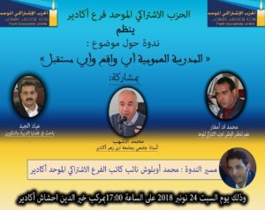 ينظم فرع اكادير للحزب الاشتراكي الموحد ندوة في موضوع:” المدرسة العمومية أي واقع وأي مستقبل” وذلك يوم السبت 24 نونبر 2018 بالمركب الثقافي محمد خير الدين- احشاش- على الساعة الخامسة مساء.