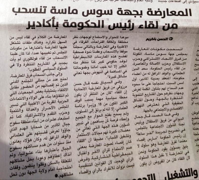 انسحبت مكونات المعارضة بمجلس جهة سوس ماسة، المكونة من فرق الاتحاد الاشتراكي وحزب الاستقلال وحزب الاصالة والمعاصرة، من لقاء العثماني والوفد المرافق له من أعضاء حكومته، المنعقد بمدينة أكادير أول يوم السبت 6 أكتوبر، احتجاجا على ما سماه هؤلاء من عدم السماح لهم من تناول الكلمة لعرض وجهات نظرهم حول المشاريع التنموية المنتظرة بالجهة وحول المشاكل الحقيقية التي تعترض النهوض الاقتصادي والاجتماعي  بالجهة.