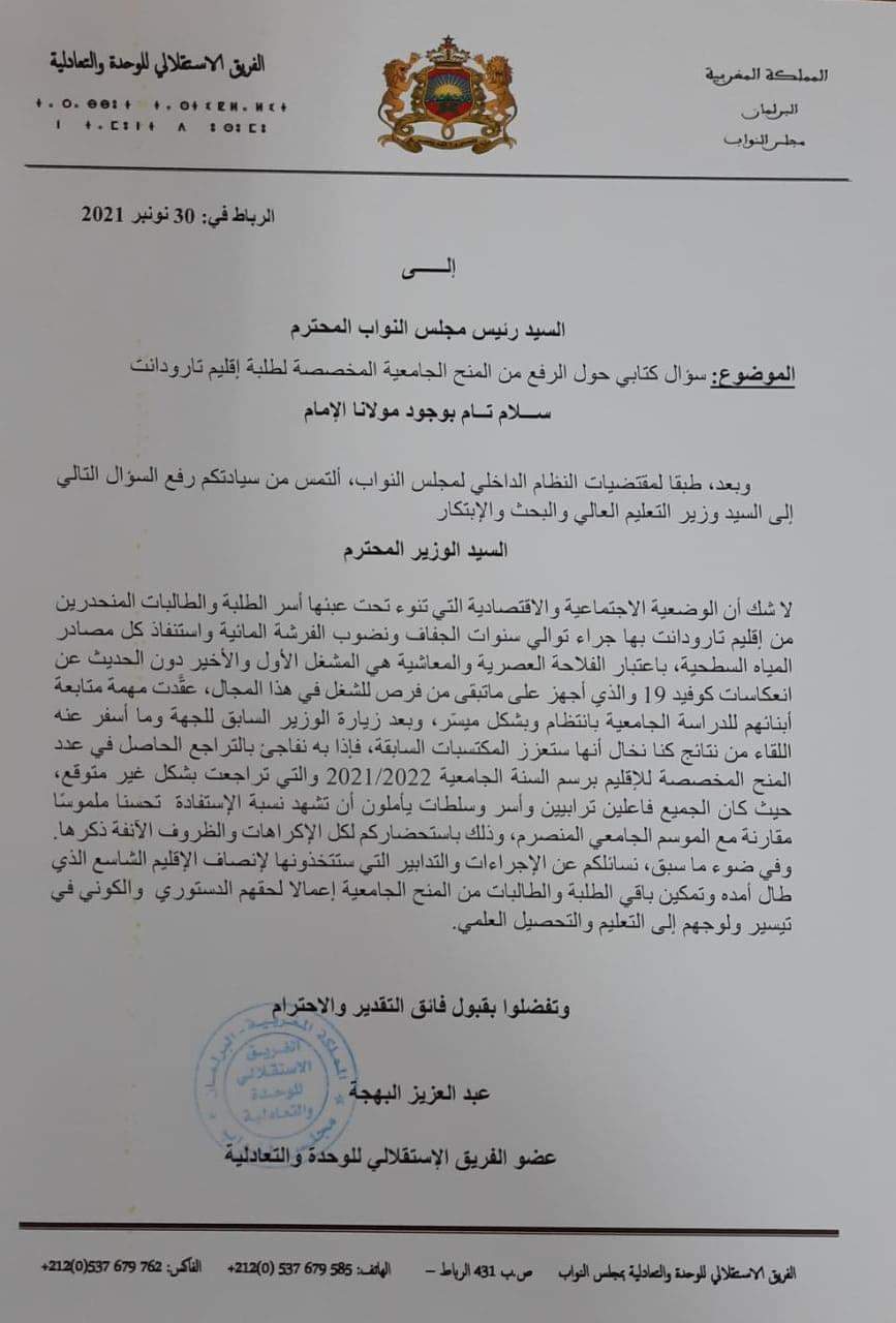 وجه السيد النائب البرلماني عبدالعزيز البهجة يومه الثلاثاء 30 نونبر 2021 ، سؤالا كتابيا إلى السيد الوزير، يدعوه من خلال إلى ضرورة إتخاذ تدابير إستعجالية من أجل الرفع من حصة المنح الجامعية المخصصة لأبناء الإقليم والذي يشهد مستوى إجتماعي متفاوت، خاصة في ظل الظروف الإجتماعية الصعبة التي خلفتها تداعيات جائحة كورونا على العديد من الأسر.