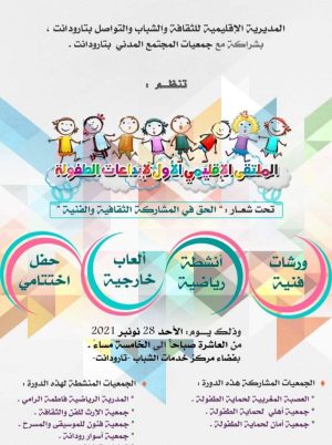 تم افتتاح الملتقى الإقليمي لإبداعات الطفولة صباح يوم الأحد 28 نونبر 2021 بمركز خدمات الشباب بتارودانت بحضور الأستاذة حسناء بوحماد عن المديرية الإقليمية وبحضور رؤساء عدة جمعيات تشتغل في مجال الطفولة. والملتقى الأول من تنظيم المديرية الإقليمية للثقافة والشباب والتواصل بشراكة مع المجتمع المدني تحت شعار ” الحق في المشاركة الثقافية والفنية”، وأشرف الفنان المسرحي المقتدر مصطفى مقداد على رئيس جمعية الفنون الموسيقى والمسرح على تقديم وتأطير فقرات افتتاح الملتقى.