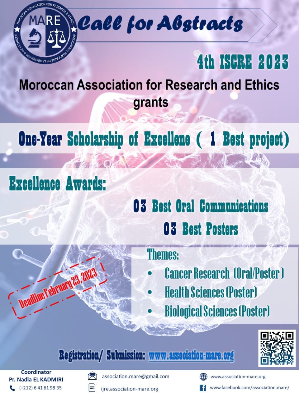 ستنظم الجمعية المغربية للبحث العلمي والاخلاقيات بشراكة مع مؤسسة للالة سلمى للوقاية وعلاج السرطان، الجمعية المغربية لسجلات السرطان، المجموعة الفرنكوفونية المغاربية للأطباء الإشعاعيين، مركز محمد السادس لعلاج السرطان بالمستشفى الجامعي ابن رشد والمبادرة الوطنية للتنمية البشرية بإقليم تارودانت؛ الندوة الدولية للبحث العلمي والاخلاقيات في نسختها الرابعة تحت شعار ” سرطاني الثدي وعنق الرحم: “المستجدات العلاجية والعلمية”؛ و ذلك يومي 17 و 18 مارس 2023 بالكلية متعددة التخصصات بتارودانت.