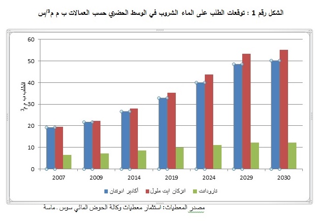 يلاحظ انطلاقا من الشكل، أن عمالة إنزكان أيت ملول، تعرف ارتفاعا في الطلب على الماء، حيث تم تسجيل 19.5 م م3/س سنة 2007. ليتوقع ارتفاع هذا الطلب خلال سنة 2030 إلى 55.15 م م3/س. بينما أقل طلب يسجل في عمالة تارودانت حيث انتقل من 6.48 م م3/س سنة 2007، إلى 12.22 م م3/س سنة 2030. وهذا الطلب يزيد بوثيرة بطيئة بسبب انخراط السكان في تنظيمات التزود بالماء، أو جلبه من الجماعة أو حفر الآبار الشخصية.