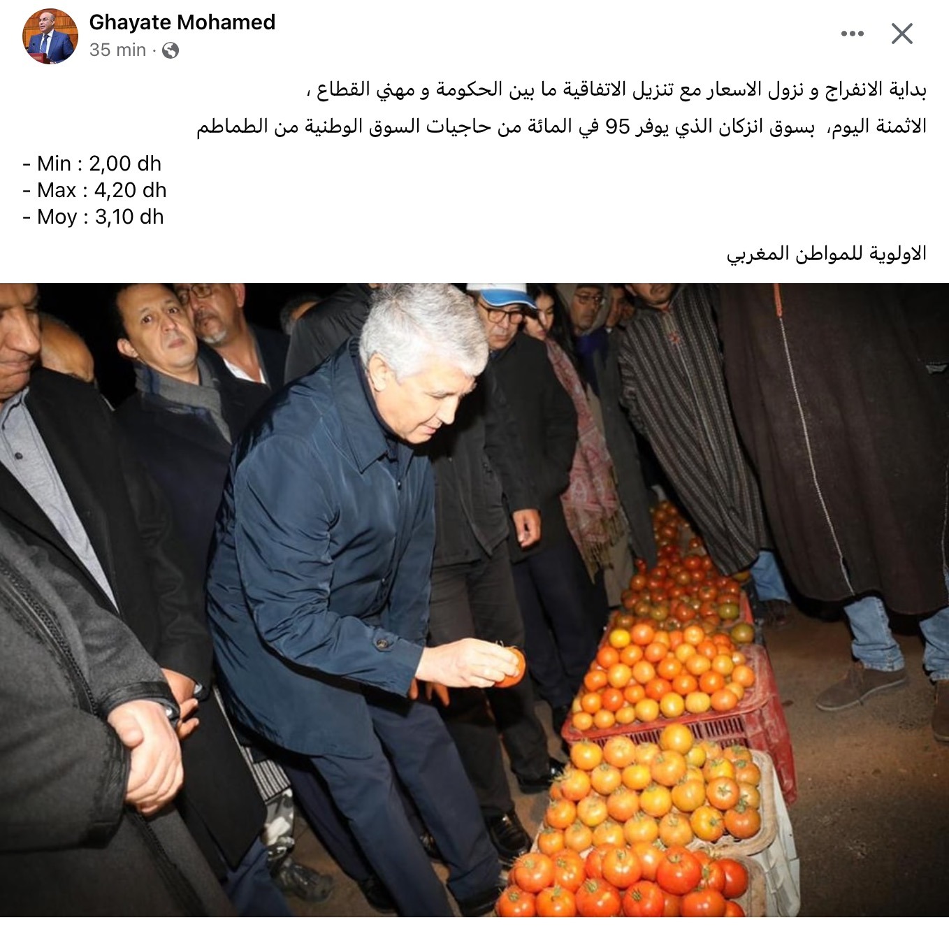 وجاء في تدوينة قيادي “الحمامة: “بداية الانفراج ونزول الأسعار مع تنزيل الاتفاقية ما بين الحكومة ومهنيي القطاع”، مشيرا إلى أن: “الأثمنة اليوم، بسوق الجملة بإنزكان الذي يوفر 95 بالمائة من حاجيات السوق الوطنية من الطماطم، تراوحت بين درهمين و 4.20 دارهم”.