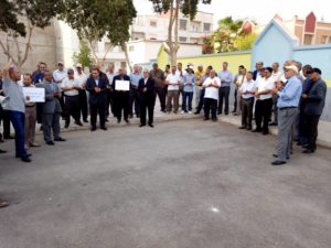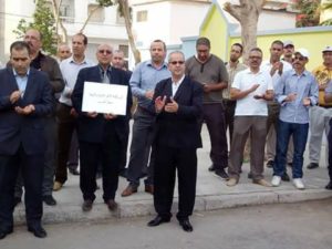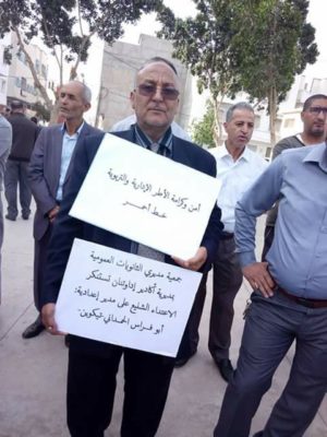 على إثر الاعتداء الشنيع الذي تعرض له مدير الثانوية إلاعدادية أبي فراس الحمداني من طرف أب تلميذ أثناء قيامه بواجبه نظم زملاؤه مديرو المؤسسات التعليمية بالاقليم وقفة تضامنية/نضالية بتنسيق مع النقابة الوطنية للتعليم المنضوية تحت لواء الاتحاد المغربي للشغل يوم الجمهة 13 اكتوبر 2017 ابتداء من الساعة التاسعة صباحا أمام الباب الرئيسي للمؤسسة رفعت خلالها شعارات تدين هذا التصرف الهمجي و تطالب بتعزيز الامن ومحاصرة ظاهرة الاعتداءات ضد رجال التعليم من قبيل : ” امن وكرامة الاطر الادارية والتربوية خط احمر”