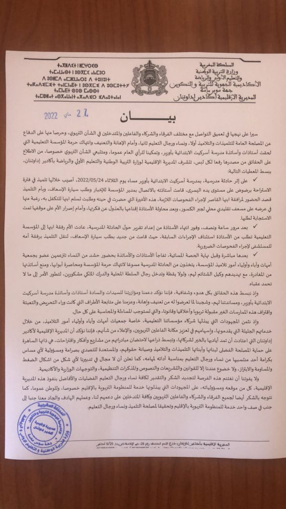 سيرا على نهجها في تعميق التواصل مع مختلف الفرقاء والشركاء والفاعلين والمتدخلين في الشأن التربوي، وحرصا منها على الدفاع عن المصلحة العامة للتلميذات والتلاميذ أولا، ونساء ورجال التعليم ثانيا، وأمام الإهانة والتعنيف وانتهاك حرمة المؤسسة التعليمية التي لحقت أستاذات وأساتذة مدرسة أسركيت الابتدائية بأورير، وتمكينا للرأي العام عموما، ومتتبعي الشأن التربوي خصوصا، من الاطلاع على الحقائق من مصدرها رفعا لكل لبس، تتشرف المديرية الإقليمية لوزارة التربية الوطنية والتعليم الأولي والرياضة بأكادير إداوتنان، ببسط المعطيات التالية: