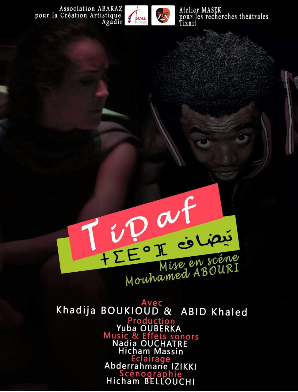 مسرحية “تيضاف” هي عمل درامي أمازيغي مقتبس من مسرحية “هو يطارد الشيطان” للكاتب الكبير بريخت و من اخراج المبدع محمد ابوري و أداء خديجة بوكيوض و عابد خالد و طاقات شابة اخرى ، وتيضاف مسرحية تتسم فيها الكوميديا بالخشونة و السخرية القوية اضافة الى الجرأة الكاملة في تناول موضوع العلاقات العاطفية، و ذلك من خلال قصة فتاة تدعى “تفاوت”،التي تقوم بتعرية مجموعة من التناقضات المجتمعية بمساعدة فيلسوف يدعى “أسافو”، هذا الأخير استطاع برؤيته النقدية الكشف عن مواطن الاضطراب في قالب فانتازي ظهرت من خلاله تلميحات جوهرية عكست مختلف الجوانب الباثولوجية لشخصيات أخرى: الأب، الأم ، الحارس، الراهبة… كانت تهتم فقط بالمظهر الخارجي من التقاليد و الأعراف اضافة الى المبالغة في التظاهر بالفضيلة، لتثور “تفاوت” في وجه مجتمع شرس أصبح يتلذذ باصطياد انزلاقات و أخطاء الانسان في دوامات التناقض و النفاق. و سيتم حسب بلاغ للجمعية تنظيم مجموعة من العروض بمختلف مناطق المغرب بداية من تزنيت و مدن اخرى.