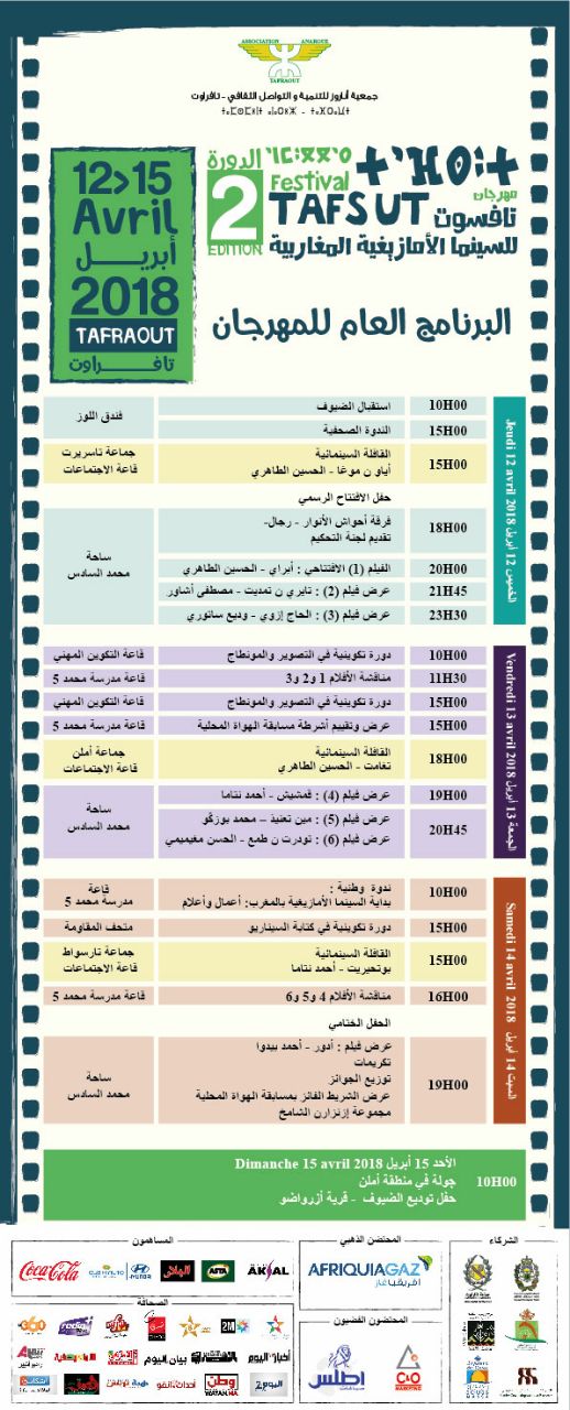 تنهي إدارة مهرجان تافسوت للسينما الأمازيغية المغاربية إلى علم جميع السينمائيين وجمهور السينما المغربية الناطقة بالأمازيغية وكافة المهتمين بالشأن السينمائي، بأنها ستنظم النسخة الثانية من المهرجان المذكور بتافراوت، وذلك من 12 إلى 15 أبريل 2018، تحت شعار: أدرار والسينما.