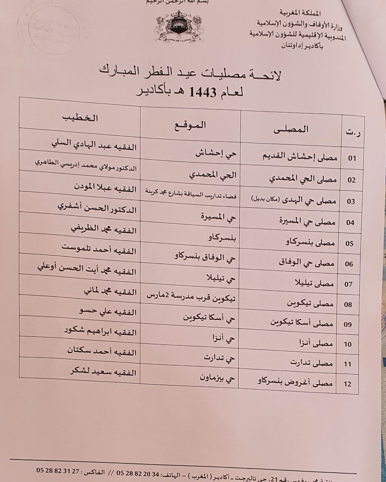 أعلنت المندوبية الجهوية للشؤون الإسلامية بجهة سوس ماسة، عن إقامة صلاة عيد الفطر المبارك ، بمدينة أكادير على الساعة السابعة صباحا (07:30) صباحا.