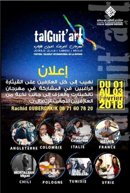 هكذا أعلن الدكتور عمر حلي عن التظاهرة الفنية التي سيحتضنها حي تلبرجت القلب النابض لمدينةأكادير، الحي الشهيد والشاهد على دمار زلزال 1960، حيث من المنتظر أن ينظم بهذا الحي مهرجانا دوليا للقيتارة من فاتح شهر فبراير القادم الى 3 منه، 3 أيام من موسيقى القيتارة لعازفين دوليين ومحليين، محترفين ومواهب، لاعطاء لحي تبرجت نكهة فنية احياء لتقاليد عرفها قبيل الزلزال الذي قتل أهم أبنائه، من فن الحلقة لأشهار فناني ترويسا.