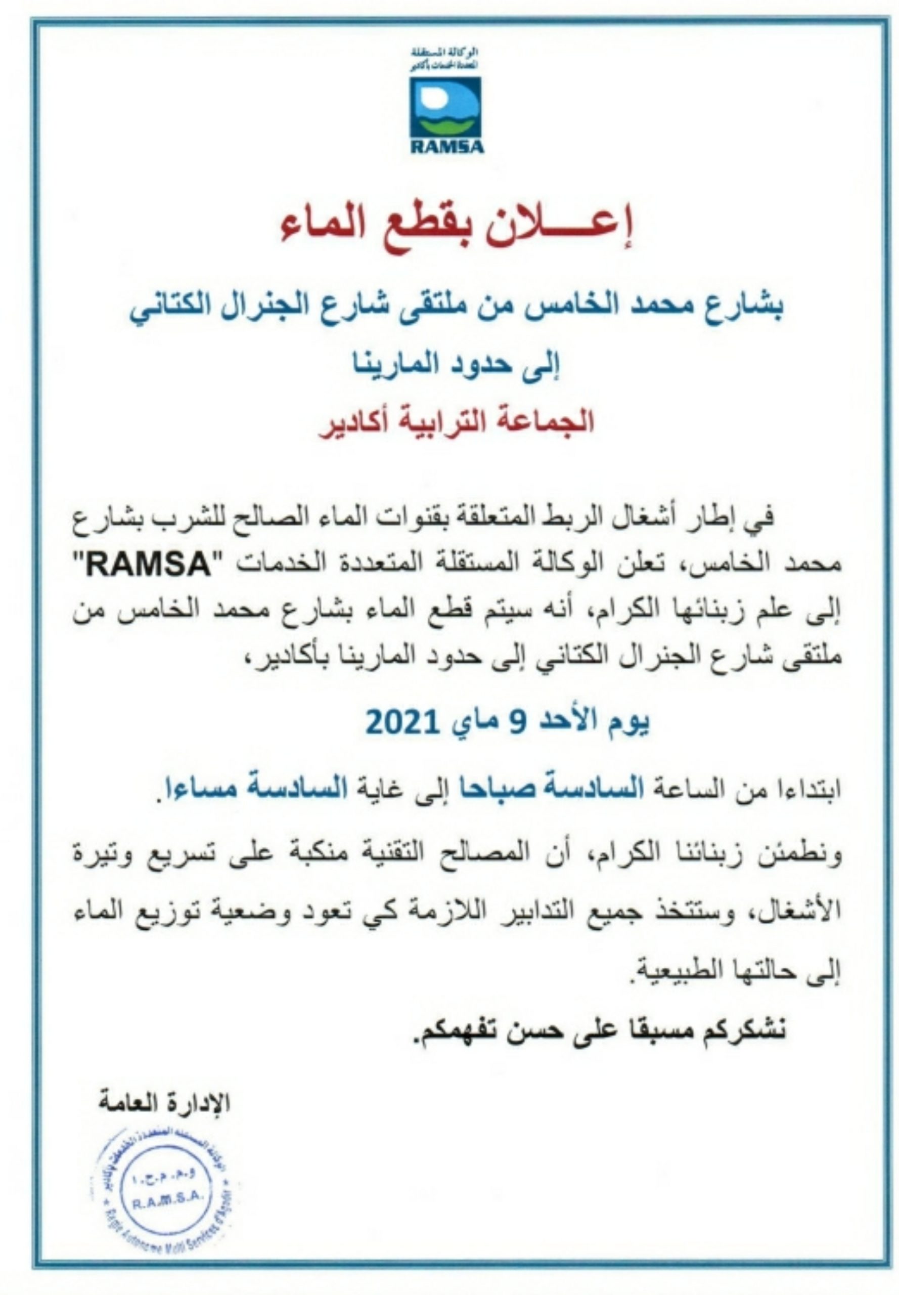 أزول بريس- أعلنت الوكالة المستقلة المتعددة الخدمات الرامسا لاكادير عن عملية مبرمجة لقطع الماء علان بقطع الماء بشارع محمد الخامس