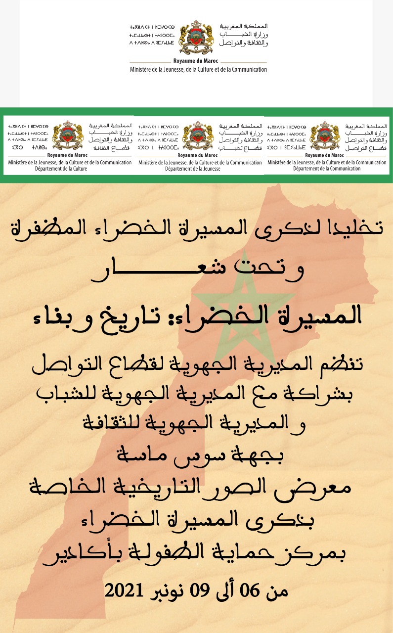 تنظم  المديرية الجهوية لقطاع التواصل، وبشراكة مع المديرية الجهوية لقطاع الثقافة والمديرية الجهوية لقطاع الشباب،  معرضا للصور التاريخية بمناسبة الاحتفال بعيد المسيرة الخضراء المظفرة تحت شعار “المسيرة الخضراء: تاريخ وبناء”. وذلك بمركز حماية الطفولة (إناث) بأكادير، في الفترة من 06 نونبر الجاري الى 09 منه.