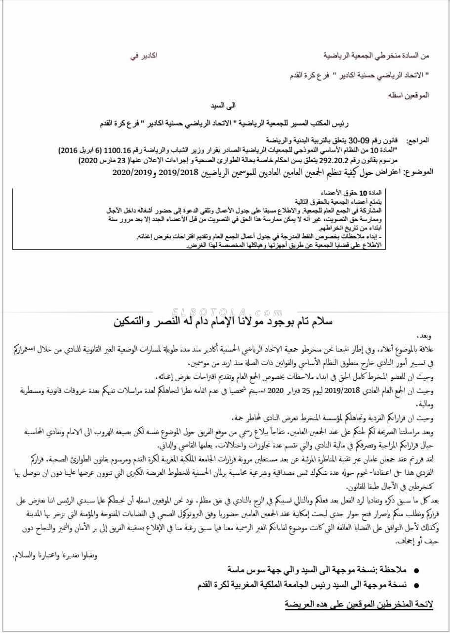 وأكد برلمان الحسنية في عريضته التي سلمت نسخة منها لوالي جهة سوس-ماسة، ونسخة لرئيس الجامعة الملكية المغربية لكرة القدم، مطالبتهم بضرورة إجراء الجمع العام بشكل حضوري بإحدى الفضاءات المفتوحة بالمدينة، حتى يتسنى لهم مناقشة جميع القضايا المتعلقة بالنادي دون حيف أو إجحاف.