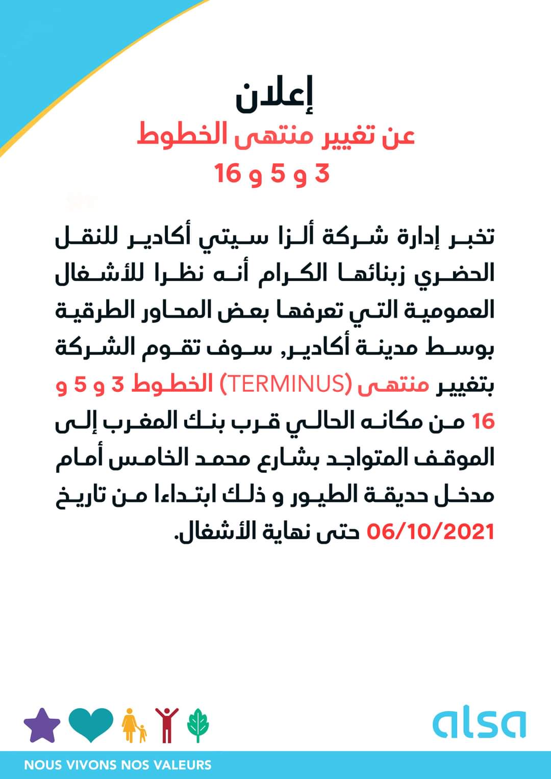 تعلن إدارة شركة ألزا سيتي أكادير للنقل الحضري زبنائها أنه نظرا للأشغال العمومية التي تعرفها بعض المحاور الطرقية بوسط مدينة أكادير، سوف تقوم الشركة بتغيير مؤقت في مسار الخط 5 حيث سيمر بشارع محمد السادس ثم شارع مولاي عبد الله ثم شارع 29 فبراير ذهابا و إيابا و ذلك ابتداءا من تاريخ 18/10/2021 حتى نهاية الأشغال.
