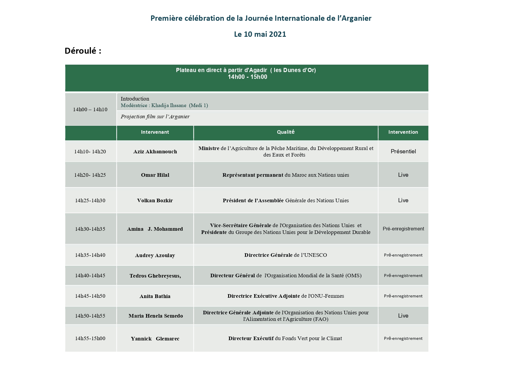 بمناسبة تخليد اليوم العالمي الأول لشجرة الأركان، تحتضن مدينة أكادير لقاء دوليا حول الموضوع برئاسة وزير الفلاحة والصيد البحري والتنمية القروية والمياه والغابات، السيد عزيز أخنوش.، من تنظيم المملكة المغربية ومنظمة الأمم المتحدة، وذلك يوم الاثنين 10 مايو 2021 ، اللقاء، الذي يحتضنه فندق الرمال الدهبية بمدينة الانبعاث، سيكون على شكل مناظرة دولية عن بعد وسيتم متابعته في جميع أنحاء العالم، حيث سينقل على القناة الإلكترونية “WebTV”، التابعة للأمم المتحدة، وكذا على موقع YouTube وشبكات التواصل الاجتماعي.