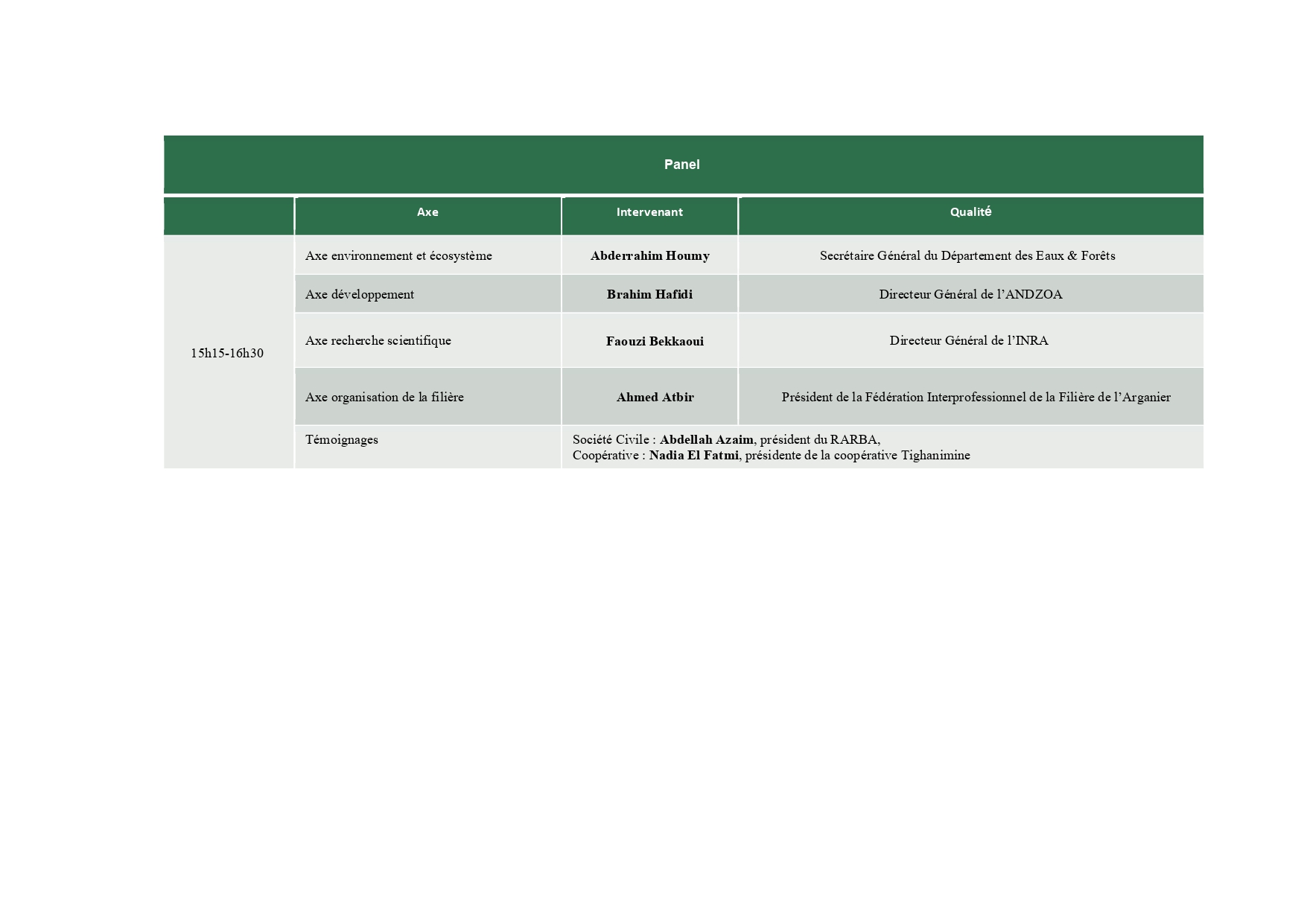 ويشارك في اللقاء كذلك عدد من المسؤولين وممثلي المجتمع المدني ذي صلة بمجال الأركان المغاربة وهم عبد الرحيم حومي من قطاع المياه والغابات التابع لوزراة الفلاحة، وابراهيم حافيدي المدير العام للوكالة الوطنية لتنمية مناطق الواحات وشجر الأركان، وفوزي بكاوي مدير المعهد الوطني للبحث الزراعي وأحمد أتبير رئيس الفدرالية البيمهنية لسلسلة أركان وعبد الله أزاييم رئيس شبكة جمعيات محمية أركان للمحيط الحيوي ونادية الفاطمي رئيسة تعاونية تيغانيمين.