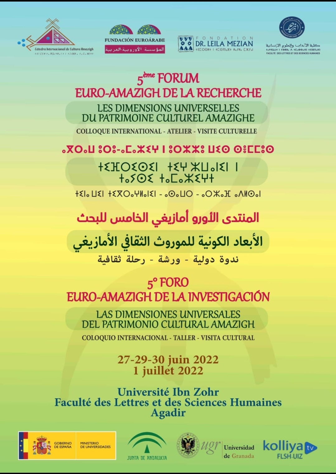 هذا المنتدى الذي سيعالج موضوع الأبعاد الكونية للموروث الثقافي الأمازيغي، تنظمه كلية الآداب والعلوم الإنسانية التابعة لجامعة ابن زهر بشراكة مع المؤسسة الأوروبية العربية، وكرسي الثقافة الأمازيغية التابع لنفس المؤسسة ومؤسسة الدكتورة ليلى مزيان وبتعاون مع جامعة غرناطة وإقليم الاندلس.