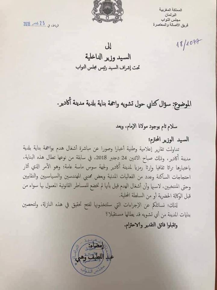 من جهة أخرى وبشكل مستعجل وجه النائب البرلماني عن تارودانت عبد اللطيف وهبي سؤالا الى وزير الداخلية حول تشويه واجهة بلدية مدينة أكادير:
