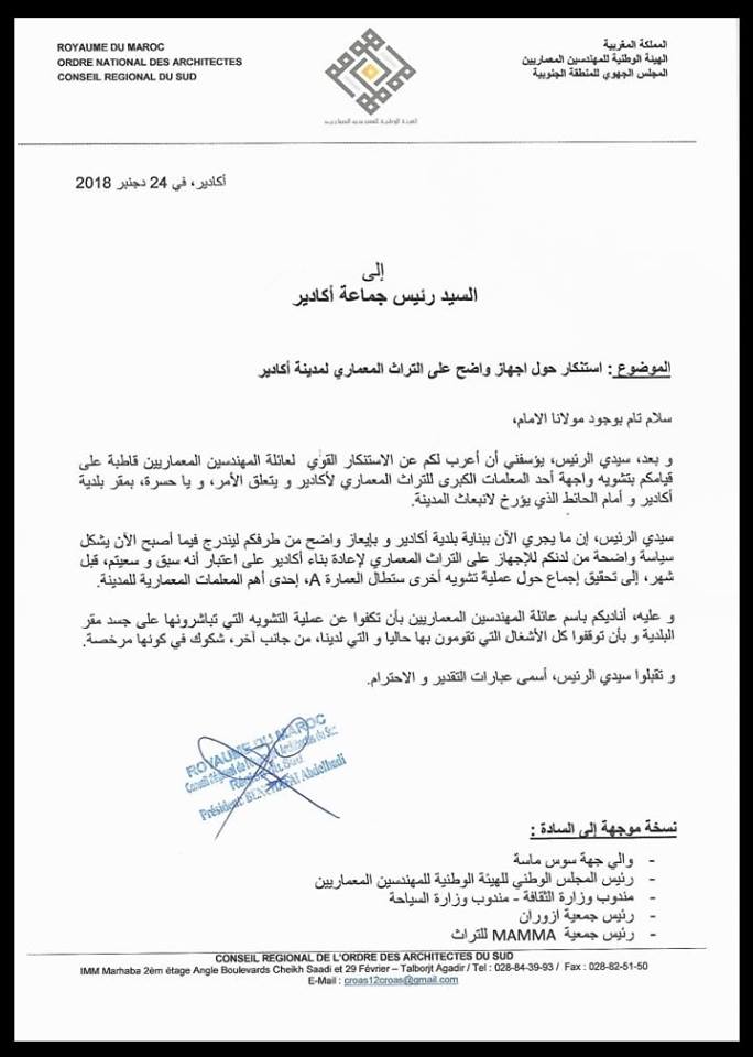 ومن جهة راسل المجلس الجهوي للمنطقة الجنوبية للهيئة الوطنية للمهندسين المعماريين رئيس البلدية مستنكرا الاجهاز الواضح على التراث المعماري لمدينة أكادير.