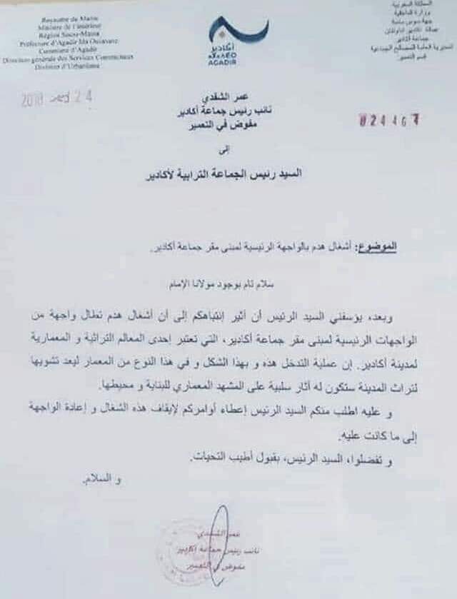 وهذا عمر الشقدي وهو نائب رئيس المجلس الجماعي لاكادير مفوض في التعمير يراسل رئيس البلدية ويحدره من هدم معمار تراثي للمدينة ويطالبه بالتراجع عن عملية الهدم واعادة واجهة البناية الى حالتها الأصلية :