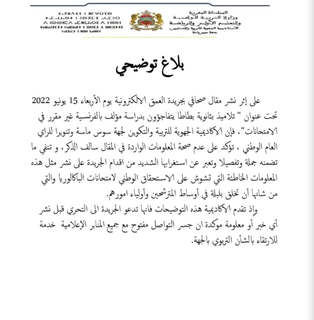 كما دعت أكاديمية سوس الجريدة إلى التحري قبل نشر أي خبر أو معلومة موكدة ان جسر التواصل مفتوح مع جميع المنابر الإعلامية خدمة للارتقاء بالشأن التربوي بالجهة.