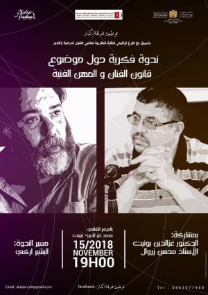 تنظم جمعية أكبار للثقافة والفنون ندوة وطنية حول قانون الفنان والمهن الفنية بالمركز الثقافي محمد خير الدين بتزنيت يوم الخميس 15 نونبر الجاري في إطار برنامج التنشيط الثقافي ضمن مشروع التوطين المسرحي لفرقة أكبار بدعم من وزارة الثقافة والاتصال.