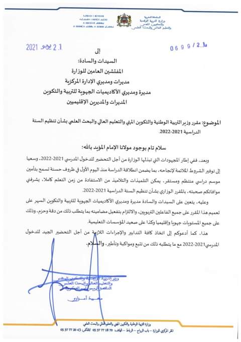 ودعا وزير التربية الوطنية، المفتشين العامين للوزارة، ومديرات ومديري الإدارة المركزية مديرة ومديري الأكاديميات الجهوية للتربية والتكوين، والمديرات والمديرين الإقليميين، إلى اتخاذ كافة التدابير والإجراءات اللازمة من أجل التحضير الجيد للدخول المدرسي 2021-2022 مع ما يتطلبه ذلك من تتبع ومواكبة وتأطير.