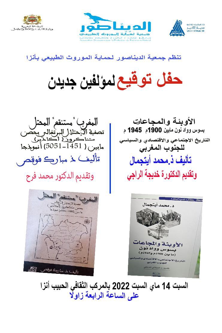 تشجيعا لثقافة الكتاب وإشاعة فعل القراءة في صفوف الشباب واليافعين بأكادير، تعتزم جمعية الديناصور لحماية الموروث الطبيعي بأنزا أكادير، تنظيم حفل توقيع لمؤلف جديد صدر للباحث مبارك فوقص المعنون: المغرب ” مستنقع” المحتل: تصفية الاحتلال البرتغالي بحصن سانتاكروز (اكادير) و أحوازه ما بين 1505 – 1541م، نموذجا. و صدر الكتاب في عن مطبعة دار الامان بالرباط في شهر اكتوبر سنة 2019، من حجم القطع المتوسط و يقع في 175 صفحة.