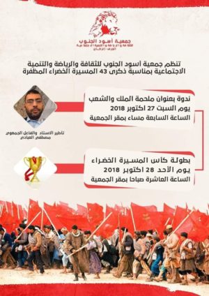تنظم جمعية اسود الجنوب للثقافة والرياضة والتنمية الاجتماعية بالجرف انزكان انشطة متنوعة يومي 27 و28 اكتوبر 2018 احتفاء بالذكرى 43 للمسيرة الخضراء المظفرة.