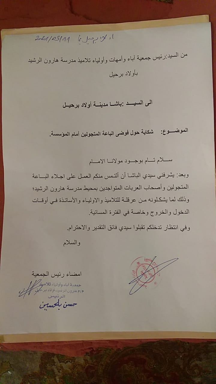 ودقت الجمعية السابقة الذكر، ناقوس الخطر لهذا الوضع المريب، حيث راسلت السلطات المحلية بأولادبرحيل، (تتوفر الجريدة على نسخة منها)، من أجل التدخل لتخليص السكان والمدرسة من هذه الفوضى التي تحاصر المنطقة، وإيجاد حلول بديلة لهؤلاء للاشتغال في أماكن مخصصة عوض احتلال الشارع وإزعاج القاطنين داخل منازلهم والتلاميذ داخل مؤسساتهم التعليمية.