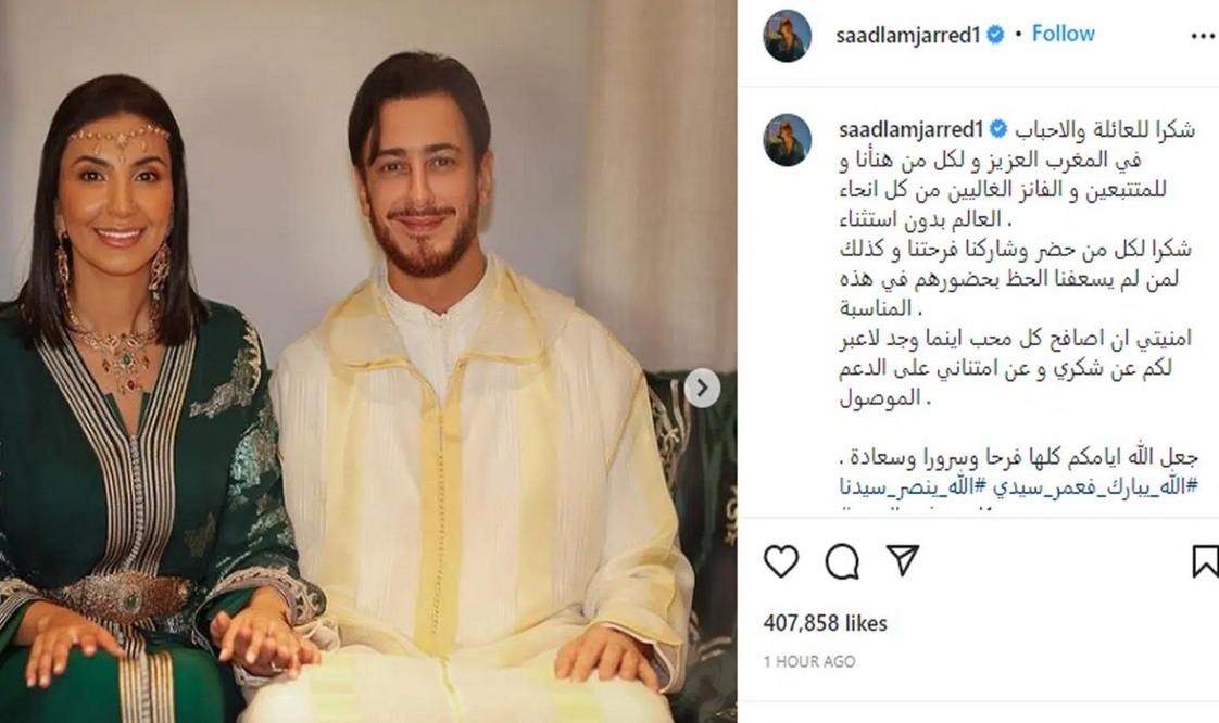 وختم سعد تدوينته بالقول “أمنيتي أن أصافح كل محب أينما وجد لأعبر لكم عن شكري وعن امتناني على الدعم الموصول”، مردفا “جعل الله أيامكم كلها فرحا وسرورا وسعادة”.
