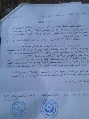 ونظم المئات من مستخدمات ومستخدمي الضيعات الفلاحية المملوكة للملياردير الصحراوي المنضوون تحت لواء الاتحاد المغربي للشغل، صباح يوم الاتنين 02 دجنبر الجاري، وقفة إحتجاجية أمام مقر عمالة اشتوكة ايت باها، مطالبين بأداء مستحقاتهم المالية التي لم يتلقوها ، و كان العشرات من عمال الضيعات الفلاحية قد قطعوا ما يناهز 15 كيلومترا في مسيرة إحتجاجية مشيا على الأقدام من منطقة ايت عميرة صوب مدينة بيوكرة.