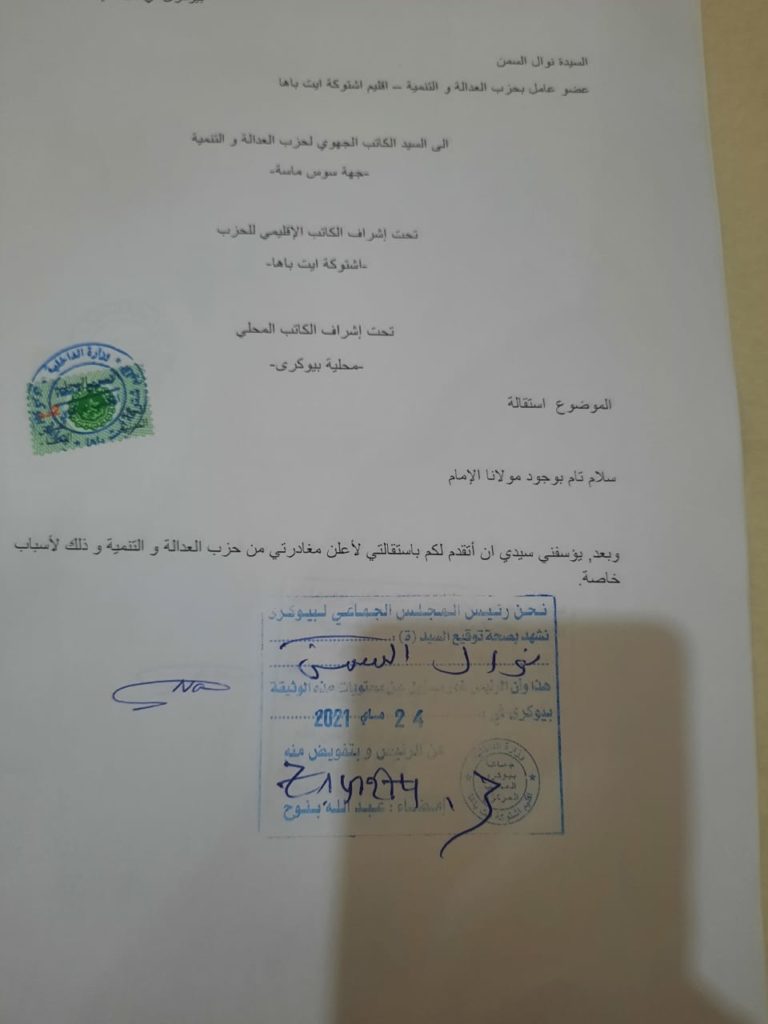 وذكرت المستشارة الجهوية في رسالتها الموجهة للكاتب الجهوي للعدالة والتنمية بسوس ماسة أن سبب مغادرتها لحزب العدالة والتنمية يعود لأسباب خاصة.