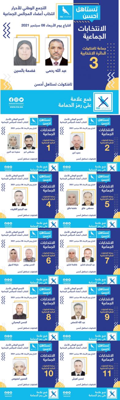 يقود السيد عبد الله رحمى من جديد لائحة تضم مرشحي حزب التجمع الوطني للأحرار بجماعة تافنكولت للظفر بولاية ثالثة، في حالة فوز فريق الحمامة بأغلبية مقاعد الجماعة ، ويذكر أن السيد رحمى قاد تجربتين ناجحتين على رأس هذه الجماعة، من سنة 2009 ألى سنة 2021 ، التجربة التي أخرجت تافنكولت “من الظلمات إلى النور”، معتمدا على جرأته وحسن تدبيره مستعينا بأعضاء المجلس وبالموطفين وبالساكنة ، الذين يثقون في مبادراته بالاجماع.