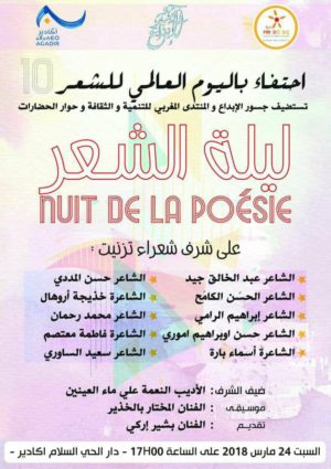 احتفاء باليوم العالمي للشعر تستضيف جسور للابداع و المنتدى المغربي للتنمية والثقافة وحوار الحضارات بشراكة مع الجماعة الحضرية لاكادير في ليلة الشعر، شعراء تيزنيت يوم السبت 24 مارس 2018 على الساعة الخامسة مساء بدار الحي السلام باكادير