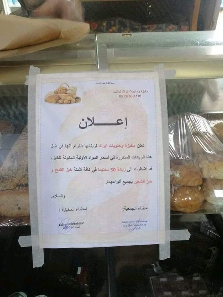 وحسب مصادر محلية فإن بعض مخابز مدينة تيزنيت أخطرت اليوم، زبناءها عبر ملصقات بزيادة 50 سنتيما في كافة أثمنة خبز القمح والشعير.