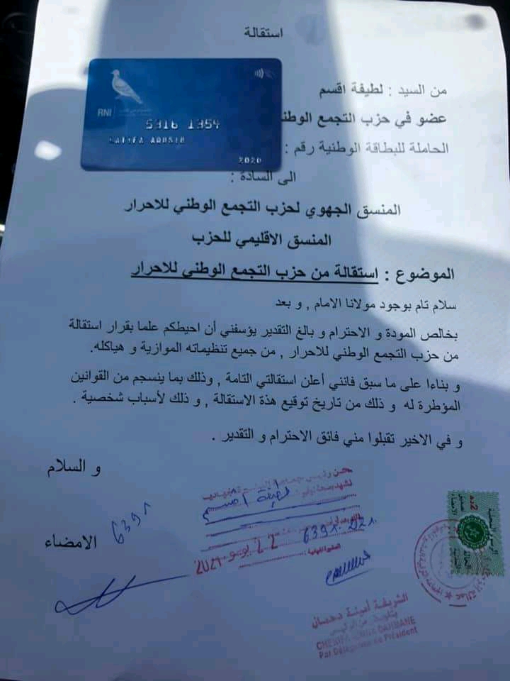 وحسب الوثيقة التي توصلت جريدة “أزول بريس” بنسخة منها، أوضحت لطيفة اقسم في استقالتها، الموجهة إلى المنسق الجهوي لحزب الوطني للأحرار وكذا المنسق الإقليمي للحزب، أن سبب الاستقالة يعود لأسباب شخصية.