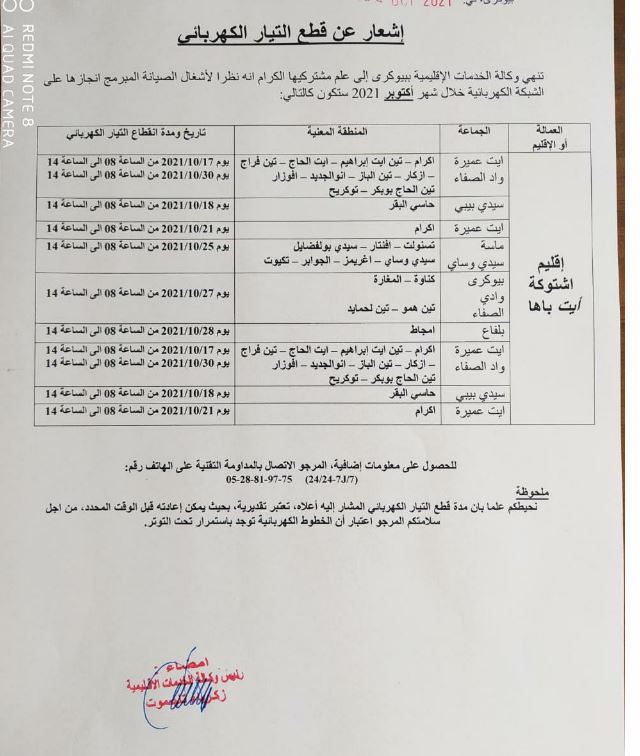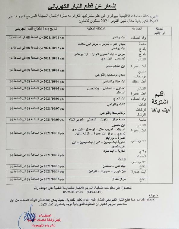 تنهي وكالة الخدمات الإقليمية لبيوكرى التابعة للمكتب الوطني للكهرباء والماء الصالح للشرب – قطاع الكهرباء- إلى علم كافة زبنائها الكرام أنه سيتم قطع التيار الكهربائي في عدة مناطق بالإقليم خلال شهر أكتوبر، وذلك نظراً لأشغال الصيانة التي يتم انجازها على الشبكة الكهربائية.