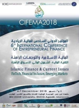 ينظم مختبر الابحاث في ريادة الاعمال المالية والتدقيق بالمدرسة الوطنية للتجارة والتسيير بأكادير وبشراكة مع المركز العالمي للاقتصاد الاسلامي وهيئات دولية اخرى فاعلة في مجال المالية والاقتصاد الاسلامي، يومي 6 و7 ديسمبر 2018 المؤتمر الدولي السادس للمالية الريادية تحت شعار: المالية الاسلامية والتوجهات الراهنة: التقنية المالية، الشمول المالي والاسواق الناشئة.