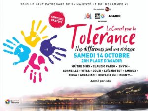 تحت الرعاية السامية لصاحب الجلالة محمد السادس يقام بمدينة أكادير ككل سنة حفل التسامح يوم السبت 14 أكتوبر 2017 على الشاطيء قرب المرينا تحت شعار : اختلافاتنا ثروة”