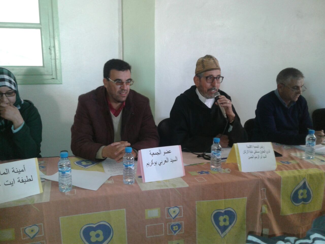 وتناول برنامج هدا الاجتماع كلمة افتتاحية لرءيسة التعاونية النسوية تزريت للاركان بارزان السيدة لطيفة ايت عبو، ثم عرض مفصل للحسين بو الرحيم تطرق فيه الى رغبة الجمعية الاقليمية لدوي الحقوق ومستغلي مجال الاركان في التواصل مع دوي الحقوق ومستغلي مجال الاركان بهدف الحد من الاكرهات ( الرعي الجاءر …الخ والتحديات( نقص في الخدمات الاجتماعية والبنية التحتية المحافظة على شجرة الاركان والبيءة عامة الخ ) كما تناول دور الجمعية في المساهمة في تاطير دوي الحقوق ومستغلي مجال الاركان للاستفادة من البرامج والمشاريع التنموية بالمنطقة .