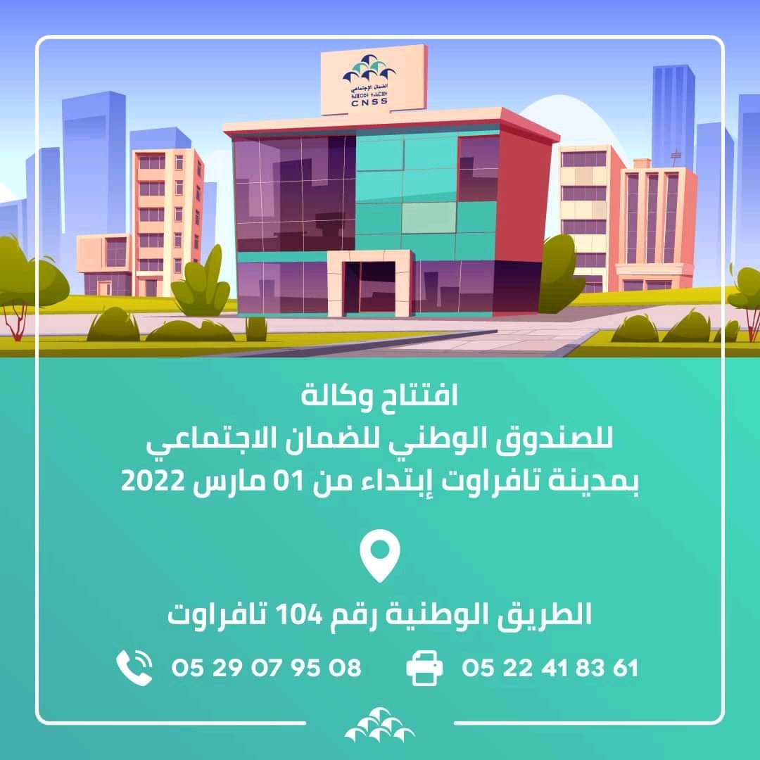 دشن صباح يوم الثلاثاء 01 مارس 2022 وكالة جديدة للضمان الاجتماعي بالطريق الوطنية 104 بتافراوت اقليم تيزنيت بوفد رسمي يتثمل في السلطات المحلية والعسكرية و ممثلي الوكالة الضمان الاجتماعي يتقدمهم المدير الجهوي للوكالة.