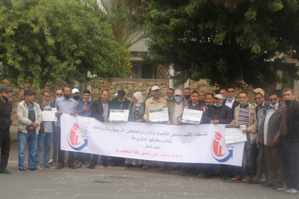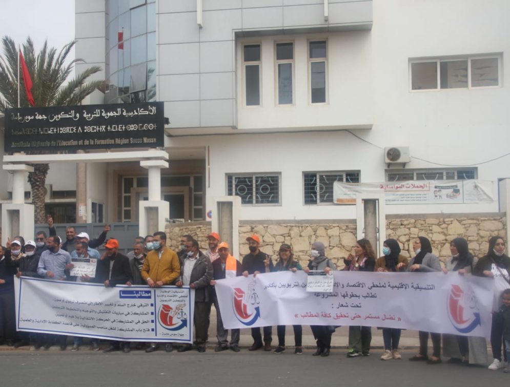 أزول بريس- على غرار الجهات الاخرى عبر تراب المملكة نظمت التنسيقية الجهوية لملحقي الاقتصاد والإدارة والملحقين التربويين صباح يوم الاربعاء 7 ابريل 2021 أمام الأكاديمية الجهوية للتربية والتكوين بجهة سوس ماسة و بحضور وازن، للتعريف والتحسيس بالمطالب المشروعة لهذه الفئة التي ظلت مهمشة بالمؤسسات التعليمية رغم بذلها مجهودات كبيرة واساسية للسير العادي للمؤسسات كما انها توجد في الواجهة مع التلاميذ،مع الاباء والعلاقة مع الطاقم التربوي والاداري والتدبير المالي اي أنها تعد المحور الأساسي في المؤسسة علاوة على أنها تشارك في تنظيم الامتحانات سواء الدراسية أو المهنية .