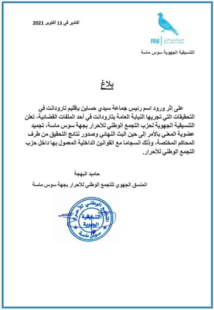 قال بلاغ للمنسقية الجهوية للأحرار بجهة سوس إن الحزب قرر تجميد عضوية رئيس جماعة سيدي احساين بإقليم تارودانت بعد ورود اسمه في تحقيقات قضائية، وأضاف البلاغ أن الأحرار جمد عضوية المعني بالأمر إلى حين البت النهائي في القضية، وصدور نتائج التحقيقات من طرف المحاكم.