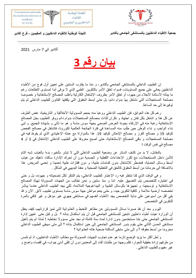 إننا كأطباء داخليين بالمستشفى الجامعي بأكادير، و بعد طرق كل الأبواب و استنفاذنا لكل وسائل الحوار، نعلن للرأي العام المحلي و الوطني ما يلي :