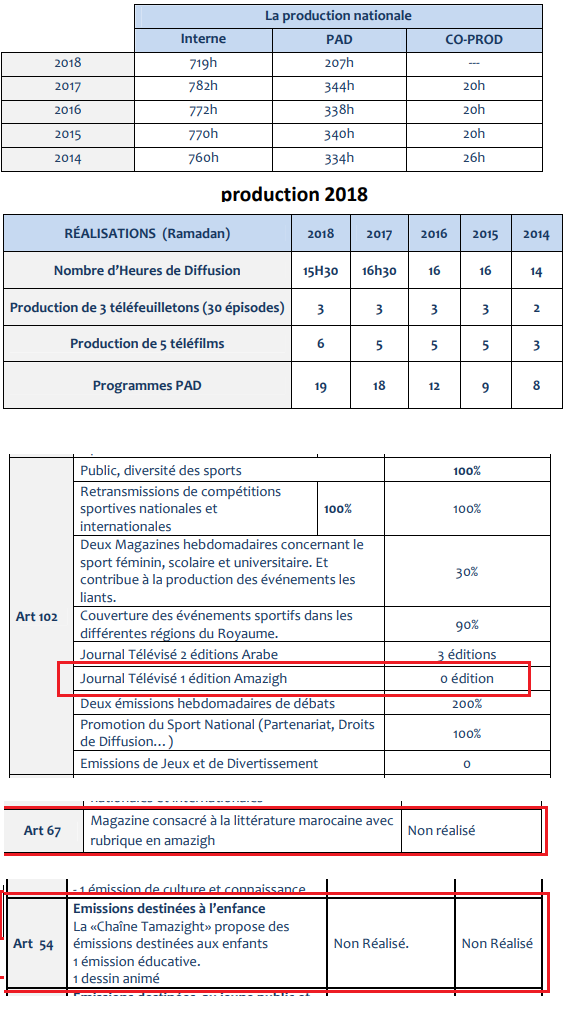 أما بخصوص تنفيذ قنوات الشركة لالتزاماتها في مجال الإنتاج والبث باللغة الأمازيغية، فإن المعطيات الواردة في التقرير كانت غامضة وغير مفصلة خاصة فيما يتعلق بالبرامج التي تم إنتاجها سنة 2018 والشركات المستفيدة من الإنتاج. بل إنّ التقرير تعمّد في صفحته 45 إغفال معطيات حول تنفيذ التزامات القناة الأولى في مجال البث بالأمازيغية، ونفس الشئ بالنسبة لقناة أفلام في الصفحة 62.