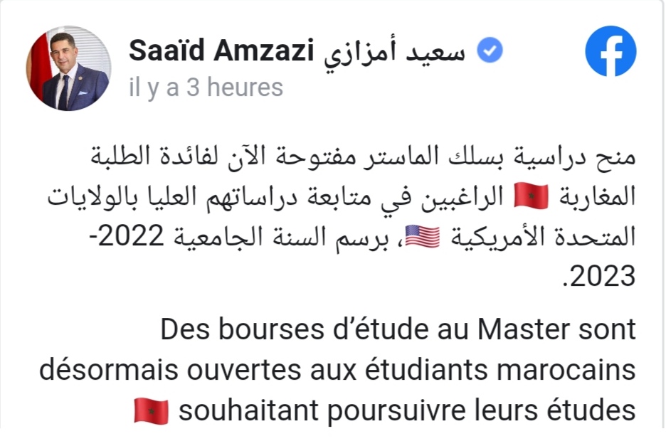 نشر وزير التربية الوطنية والتعليم العالي والبحث العلمي، السعيد أمزازي، تدوينة عبر صفحته الرسمية على فيسبوك، يعلن من خلالها عن أن منحا دراسية بسلك الماستر مفتوحة الآن لفائدة الطلبة المغاربة الراغبين في متابعة دراساتهم العليا بالولايات المتحدة الأمريكية ، برسم السنة الجامعية 2022-2023.